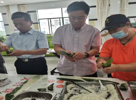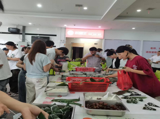 在关山校区食堂三楼,后勤服务集团党政主要负责人带领有关人员与各学院教师(含外籍老师)和毕业生代表一起填糯米、放蜜枣、裹粽叶、系马莲,同场竞技,各显身手,体验传统习俗,品味端午文化,共叙师生情谊,共迎端午佳节。