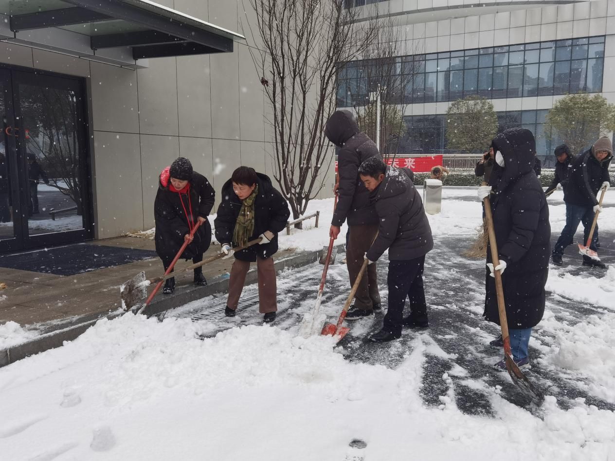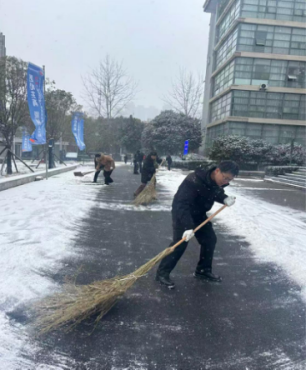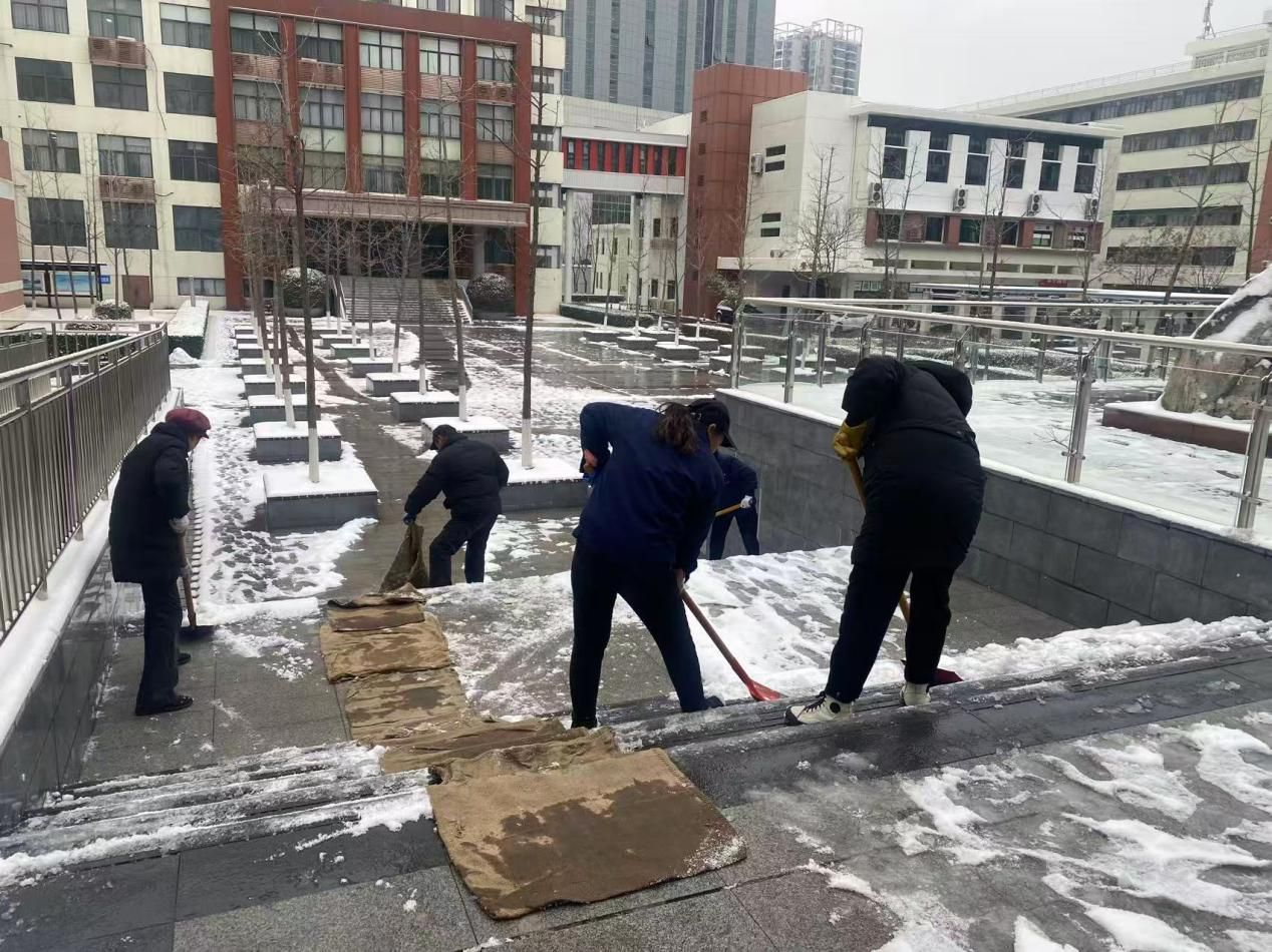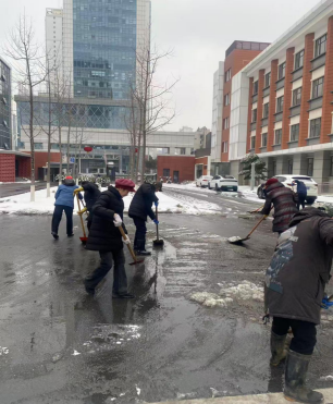 大家手持铁锹、扫帚、融雪剂等工具,不畏严寒、分工协作,有的挥舞铁锹铲雪,有的手持扫帚清扫残雪,有的撒盐防止路面结冰,在台阶、坡道等易滑区域铺设防滑垫,细致地清理每一处可能滑倒的隐患,忙碌的身影在白雪覆盖的校园中形成一道温暖的风景线,为师生营造了安全、畅通、整洁的出行环境。